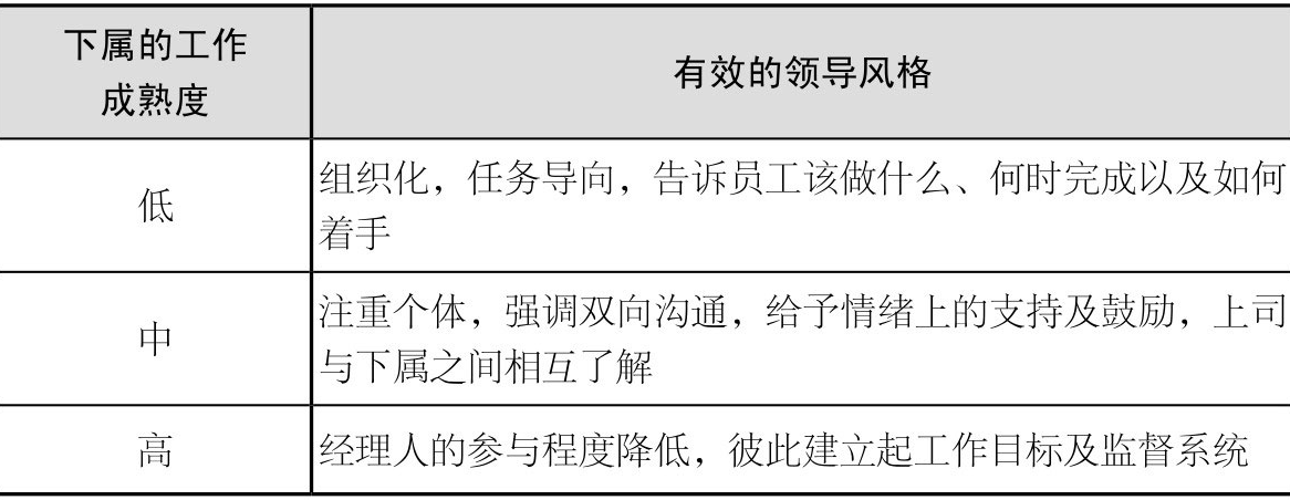 明确地说,当工作成熟度低时,最有效的管理方法是提供明确且详细的指示,在这种情形下,上司要告诉下属该做什么、何时完成、如何着手。换句话说,这时要采用非常有组织的领导作风。随着下属的工作成熟度渐增,最有效的领导方式也由组织化转为沟通、情绪上的支持与鼓励;相较于下属手上的工作,经理人应花更多的心思在这个下属身上。随着工作成熟度越来越高,管理风格也会一再改变。在更成熟的阶段,经理人对下属的干涉也应该进一步降低,主要管理目标应聚焦在确定下属的努力方向是否合乎部门的需求上。